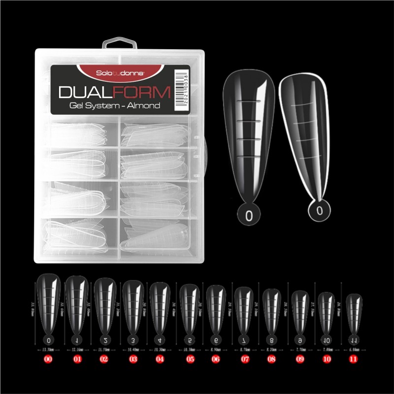 Dual Tips (Dual Form System Gel) sono delle speciali Tips che permettono di ottenere una ricostruzione perfetta in modo semplice e veloce. A differenza delle classiche tips, non vanno applicate direttamente sull’unghia, ma si utilizzano distribuendo l’Acrygel nella parte inferiore ed infine applicandolo sull’unghia. Dopo la polimerizzazione vanno rimosse e possono essere riutilizzate.