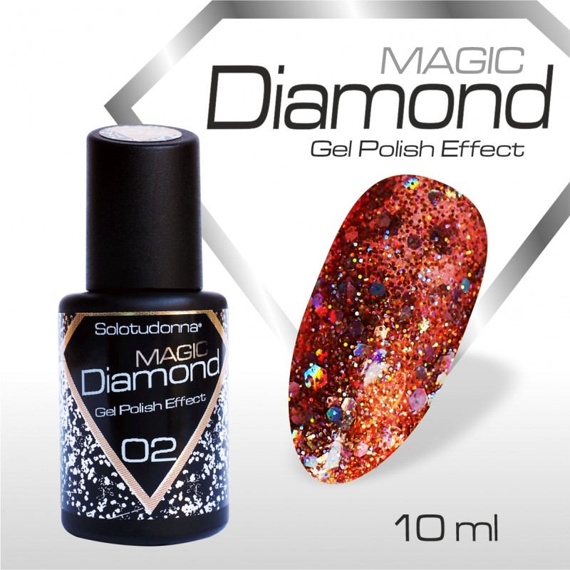 Magic Diamond è il trend del momento, una linea di semipermanenti con formula arricchita di glitter multidimensione effetto flash che si accendono quando colpiti dalla luce diretta. Un tocco Super Glamour per chi vuole distinguersi con eleganza e raffinatezza. Per un risultato più omogeneo è consigliato un doppio strato.