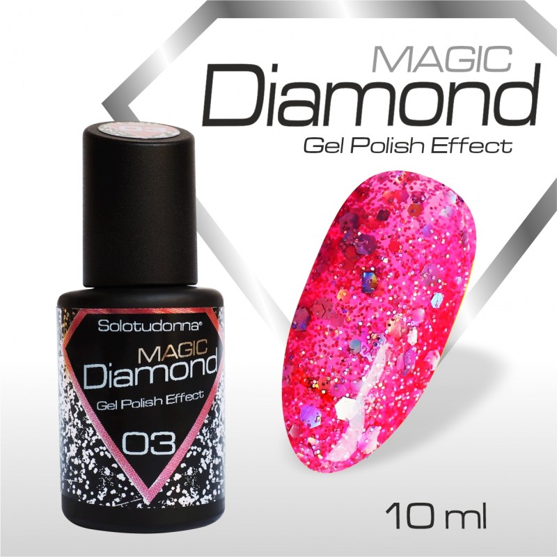 Magic Diamond è il trend del momento, una linea di semipermanenti con formula arricchita di glitter multidimensione effetto flash che si accendono quando colpiti dalla luce diretta. Un tocco Super Glamour per chi vuole distinguersi con eleganza e raffinatezza. Per un risultato più omogeneo è consigliato un doppio strato.