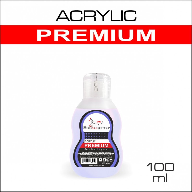 Acrylic Premium è un liquido (monomero) che unito alla polvere acrilica (polimero) genera una sostanza molto cremosa e facilmente modellabile, serve per realizzare ricostruzioni unghie molto resistenti e a lunga durata, contiene un filtro blu che permette di mantenere il colore brillante e stabile.