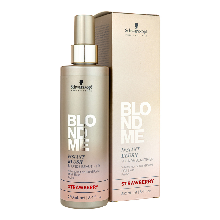 Schwarzkopf BlondMe Instant Blush Blonde Beautifier in Strawberry abbellisce il biondo con una delicata tonalità rosata. Goditi il ??colore senza impegno con Schwarzkopf Professional BlondMe Instant Blush Blonde Beautifier , un toner pastello spray per capelli colorati e biondi naturali. Durando fino a 3 lavaggi, donando equilibrio e forza ai capelli, con PH acido e complesso vitaminico.